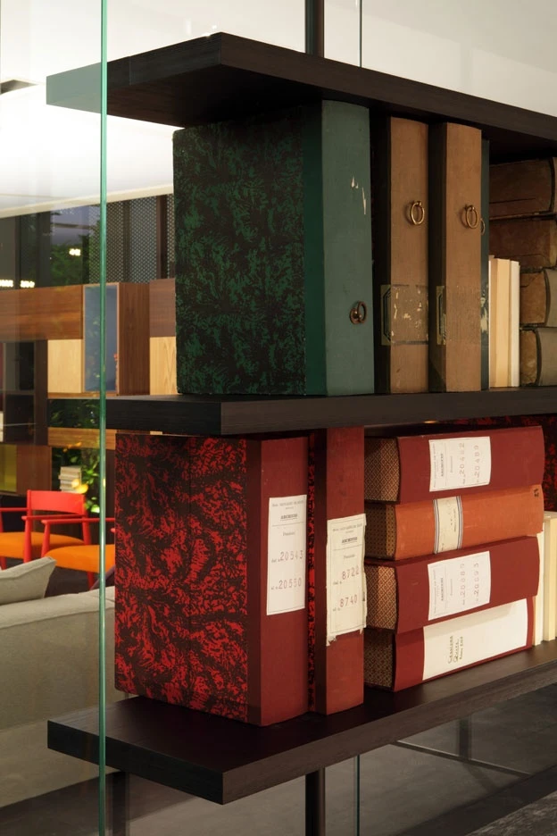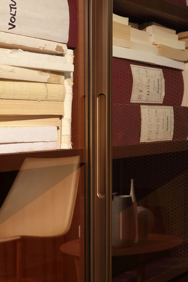 Tactility and structural use of colours characterise the first living room where the table Galileo is matched with Garda chairs, a suspended Modern sideboard, a System bookcase, the Jade armchair and the small table Shahan and the showcase-bookcase Ex-Libris.