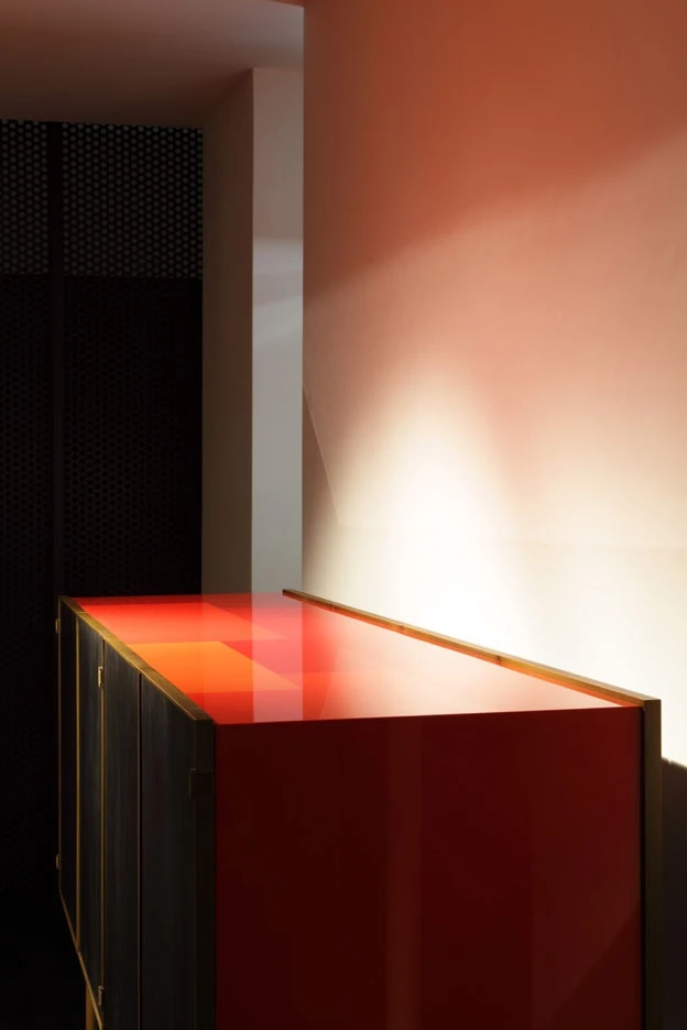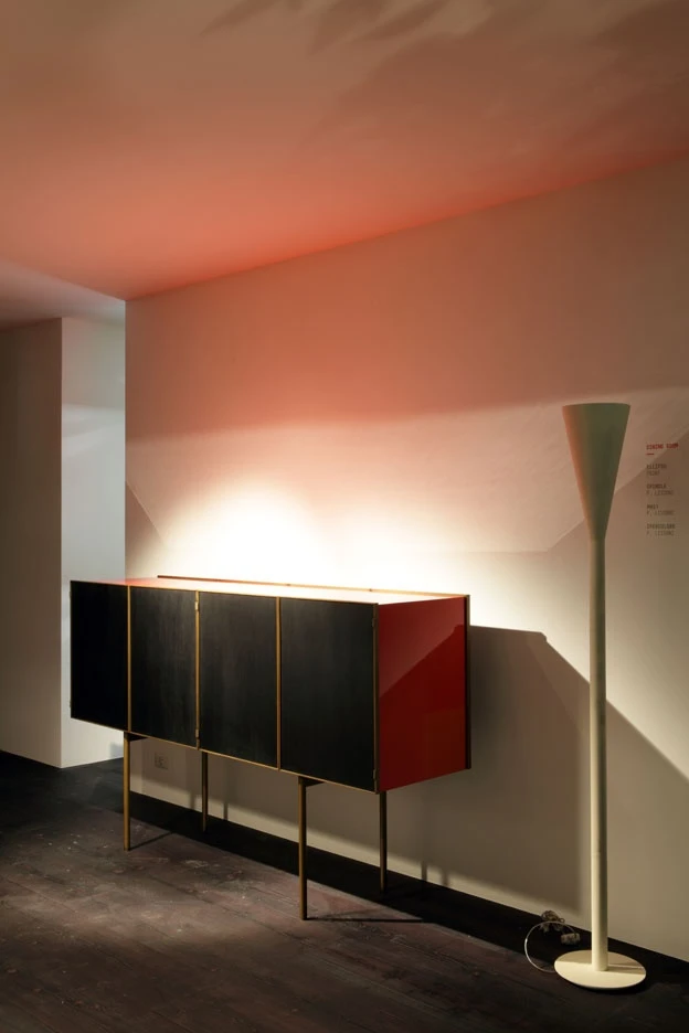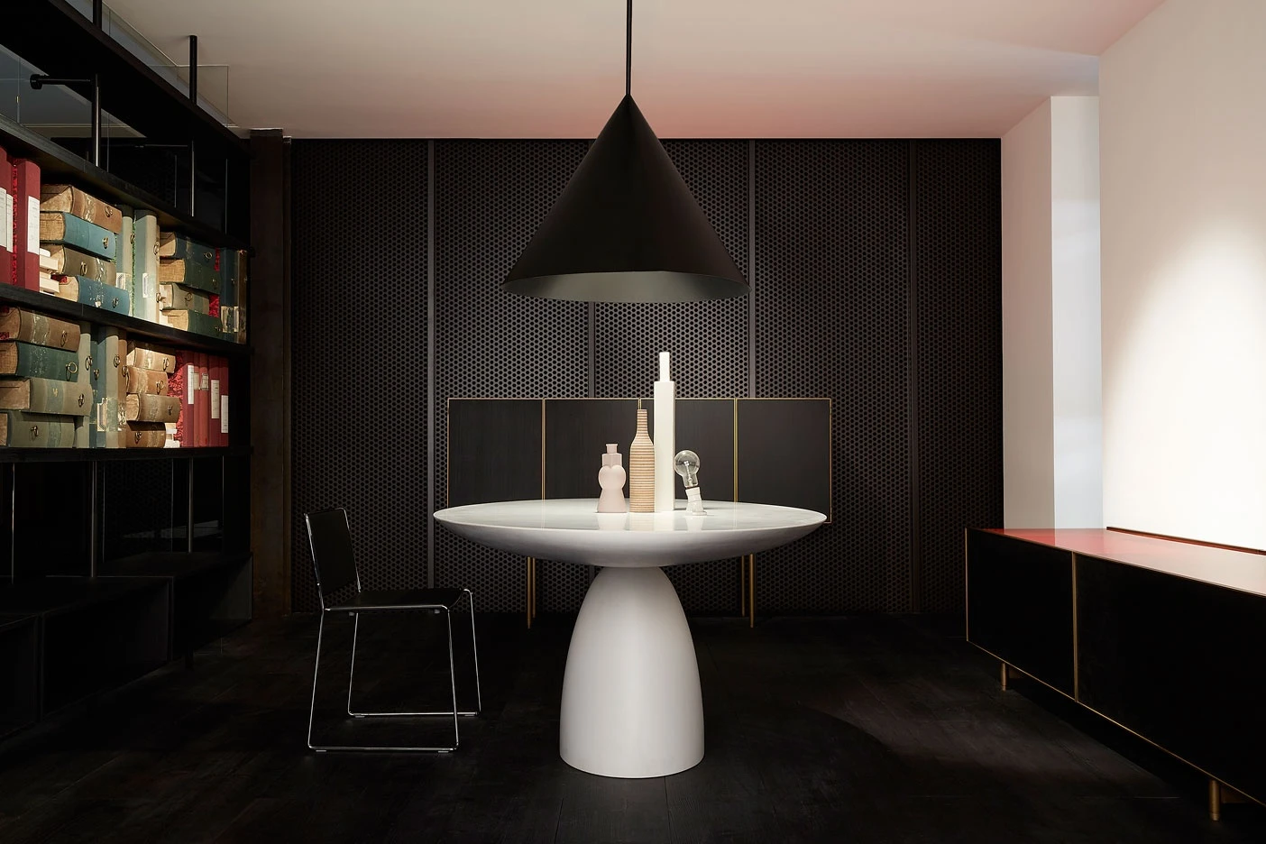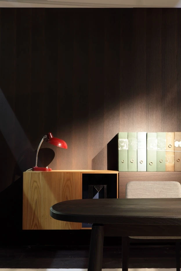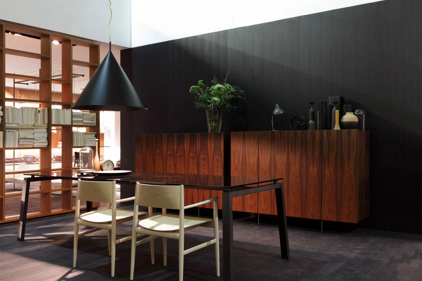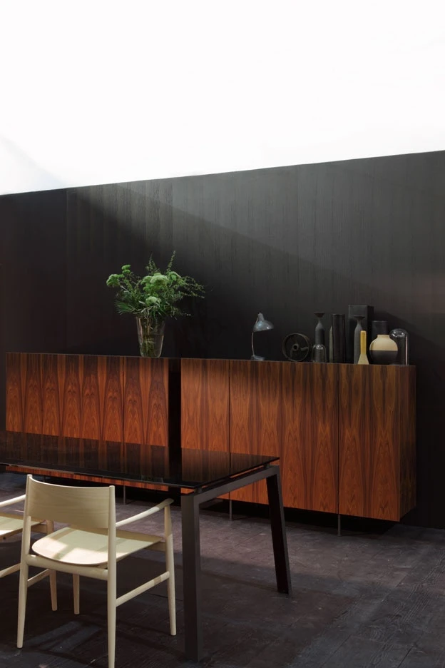 In the second living room the real protagonist is the new Ellipse Table with 4 Spindle chairs in black leather, while on the wall an unusual Mast closet turns into a unit for the living room. To hold dishes and glasses without losing character, the new Ipercolore pull-out sliding doors sideboard and high 4-hinged doors cupboard, raised on metal feet, play with the minimal design of the black stained hemlock front, back and interiors and the lively colours of the top and sides in different red shades.