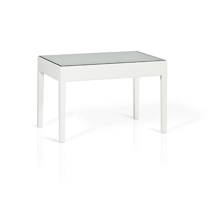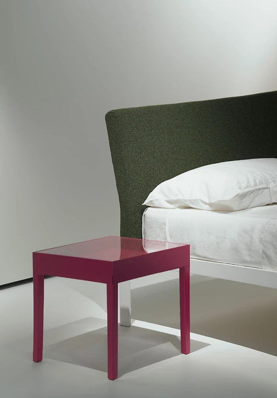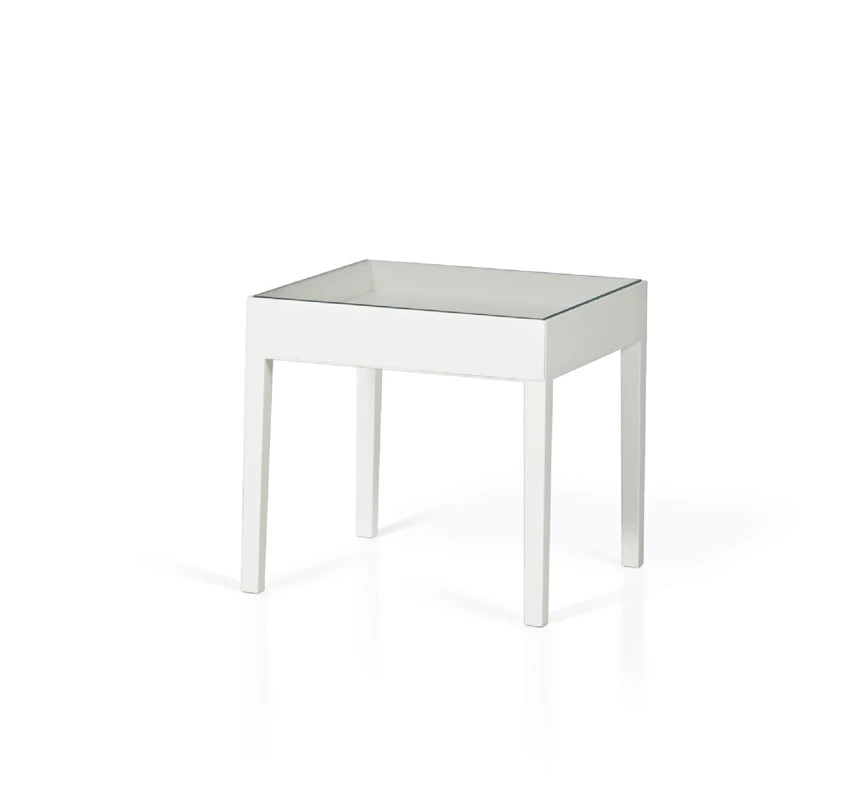 Available in two versions: square, L.450 x P.450 x H.420 mm; and rectangular L.650 x P.450 x H.420 mm. The table consists of an upper extrabright tempered glass top and a lower removable wooden top, in the same material as the structure. Showcase Table is available matt lacquered in all the colours of the collection.