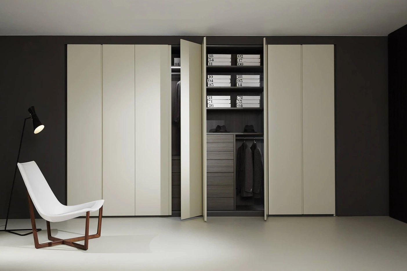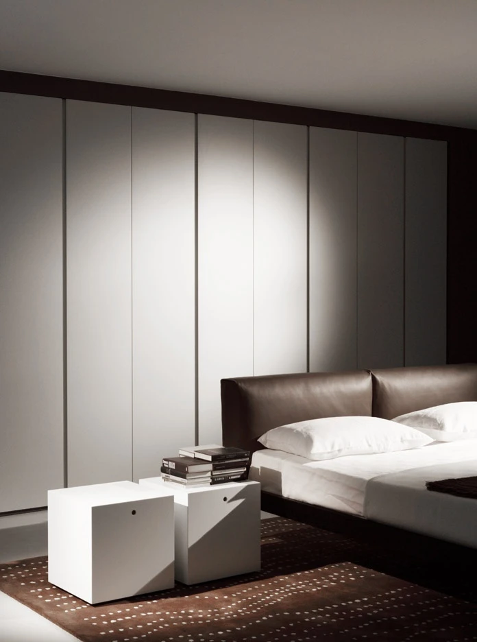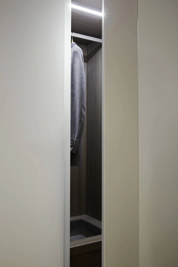 The new features introduced to Storage for 2013 include the new handleless Riff hinged doors: a groove running the full height of the panel creates a discreet, continuous profile that makes the wardrobe very easy to open. It is an architectural touch and a clean, essential motif that leaves the surface linear, while adding movement. Slender and refined, the Riff door exhibits a vertical handle on its entire height. The groove is vertically developed along the door, thus providing for a comfortable opening. The Riff door is available as a single or double door, for units 500/600/1000 and 1200 mm wide.