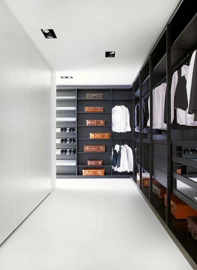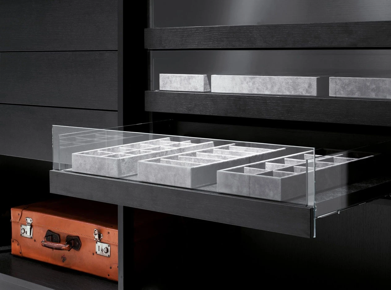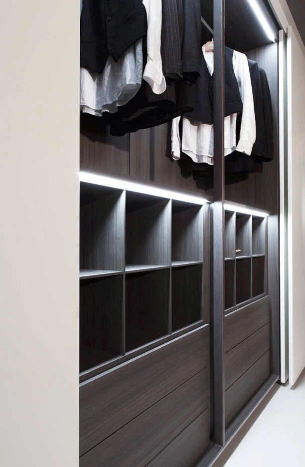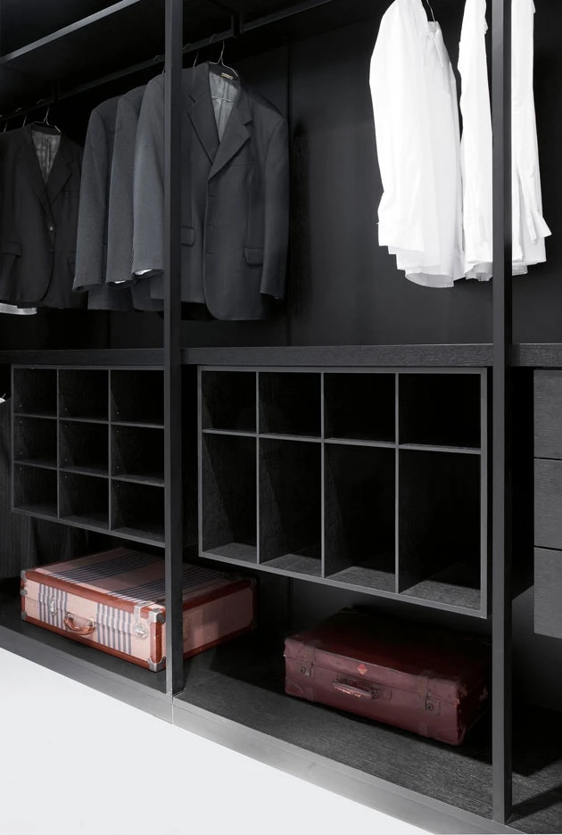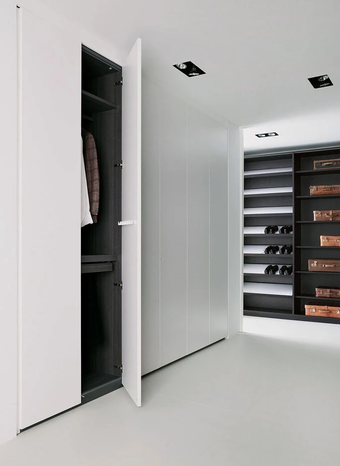 Storage, the unit system holding and displaying objects naturally changed from wardrobe to walk-in closet, is enriched in 2012 with a new series of interior fittings and accessories, as it was never so simply to tide up your own dressing but inviting and welcoming as well. The new internal LED light with an optical sensor, the new glass shelf framed by a wood profile, only partially hiding its content, the new bag-holder units, the fabric boxes to be held inside drawers to be used as glasses, necklace or belt cases, up to the tie hook. Last but not least the bending shelf, available in a Storage new thickness, 43 cm, as to provide for the same elegance and efficiency which always allowed this bedroom program to stand out, even in the small spaces within modern houses. As for the doors, first of all a new push-pull opening is finally available, the buttonhole of the Modern system, with no handle any longer, but simply leaving a small round imprint, a pleasant graphical sign for a higher visual cleanness.