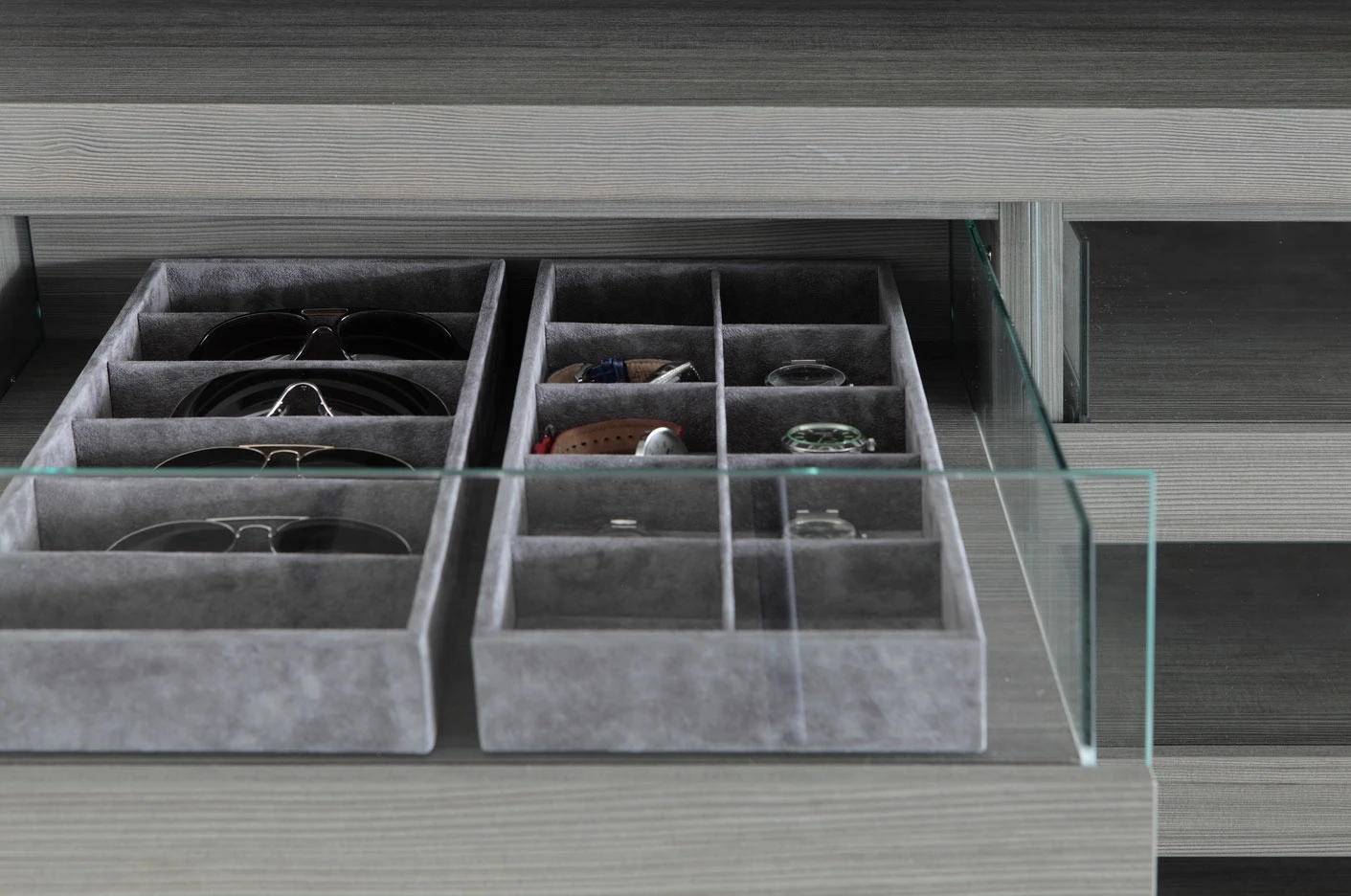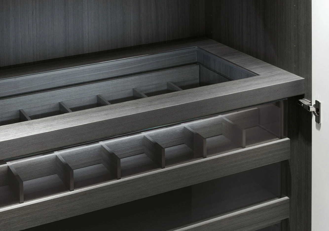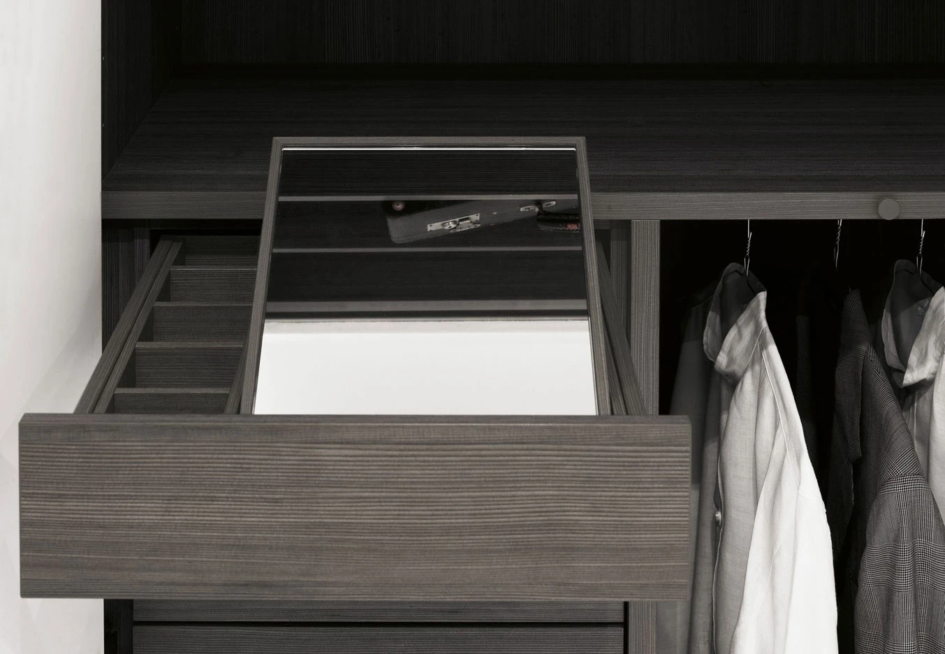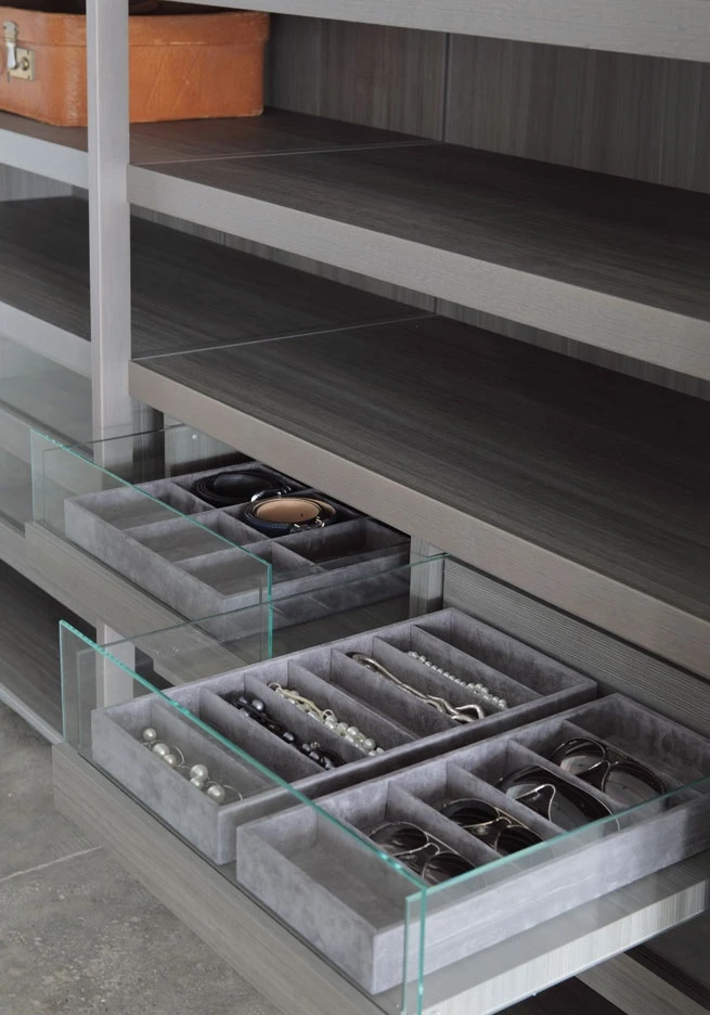 Storage, the unit system holding and displaying objects naturally changed from wardrobe to walk-in closet, is enriched in 2012 with a new series of interior fittings and accessories, as it was never so simply to tide up your own dressing but inviting and welcoming as well. The new internal LED light with an optical sensor, the new glass shelf framed by a wood profile, only partially hiding its content, the new bag-holder units, the fabric boxes to be held inside drawers to be used as glasses, necklace or belt cases, up to the tie hook. Last but not least the bending shelf, available in a Storage new thickness, 43 cm, as to provide for the same elegance and efficiency which always allowed this bedroom program to stand out, even in the small spaces within modern houses. As for the doors, first of all a new push-pull opening is finally available, the buttonhole of the Modern system, with no handle any longer, but simply leaving a small round imprint, a pleasant graphical sign for a higher visual cleanness.