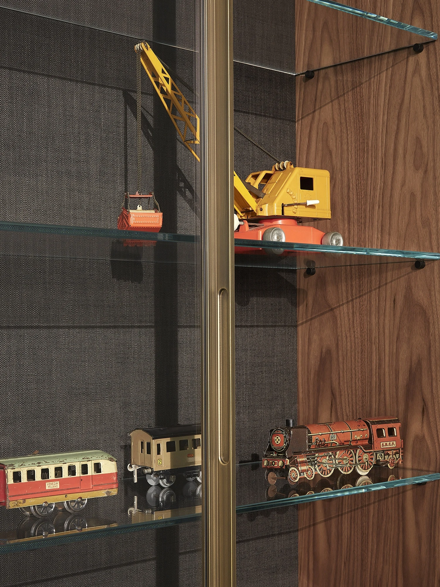thanks to a succession of full and empty spaces, wood and refined metal finishes. The glass cabinet with burnished brass Iron doors and glass shelves with led lights offers a larger space inside thanks to the upright on the front that replaces the wooden side panel. The soft textile back panel and the bookend boxes with an iron finishing complete this masculine and rigorous solution.