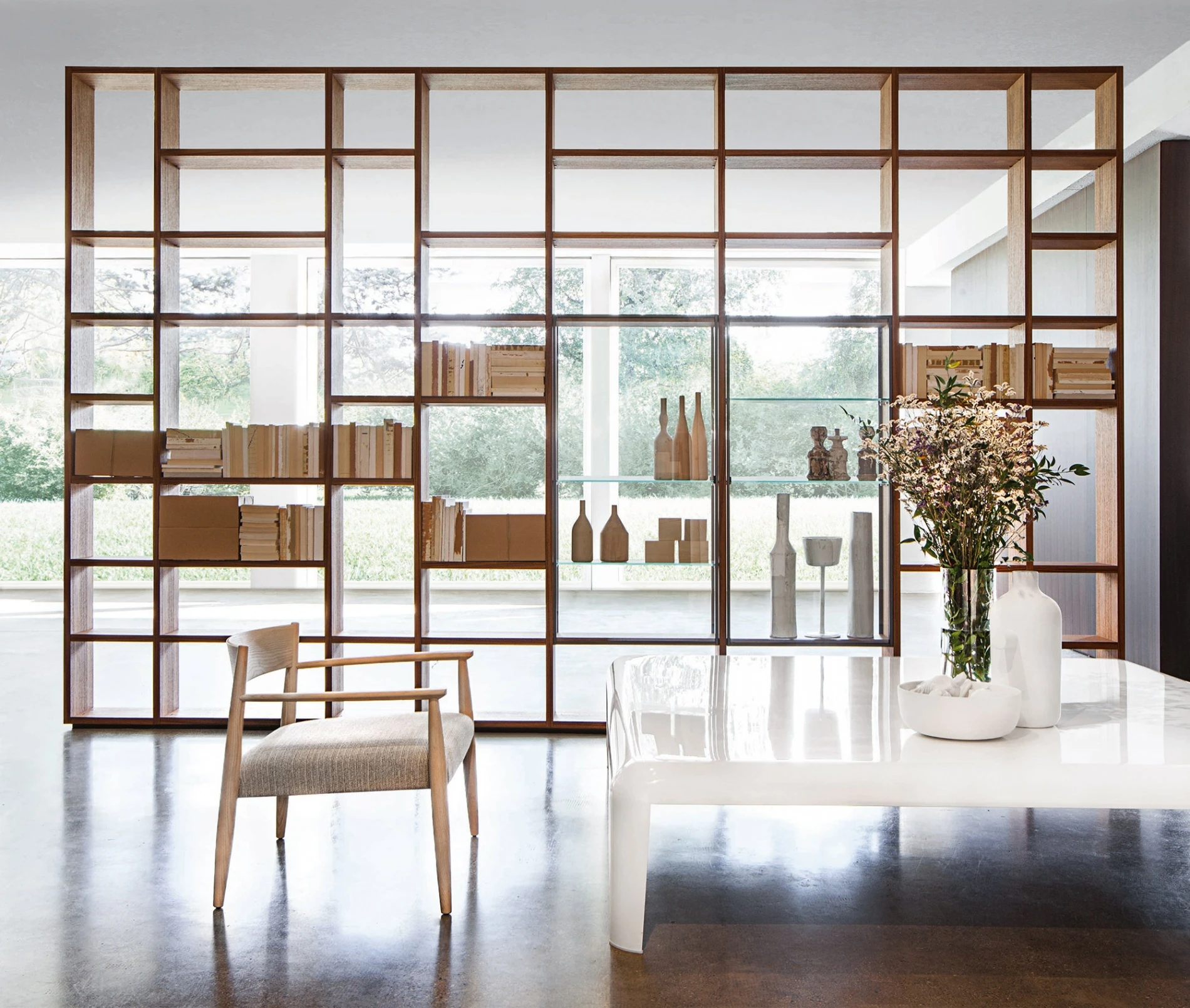 Versatile, intelligent, flexible: System enters the home and the office to meet the needs of personalities, inclinations and lifestyles of those who live there. With the wide variety and superior quality of its finishes, System is the ideal solution to plan custom furnishing projects, since it can be intelligently adapted to create highly diverse settings: classic, sophisticated, informal, or elegantly traditional. Multifunctional and eclectic due to the many functions it provides, System can be used as a bookcase, a module for electronic media, a study area, or even as an element to subdivide rooms and create equipped walls. Inspired by the precision and flexible project features of fine contemporary design, System has a strong and balanced personality defining room areas in a definitive way, while improving their efficiency and appearance.