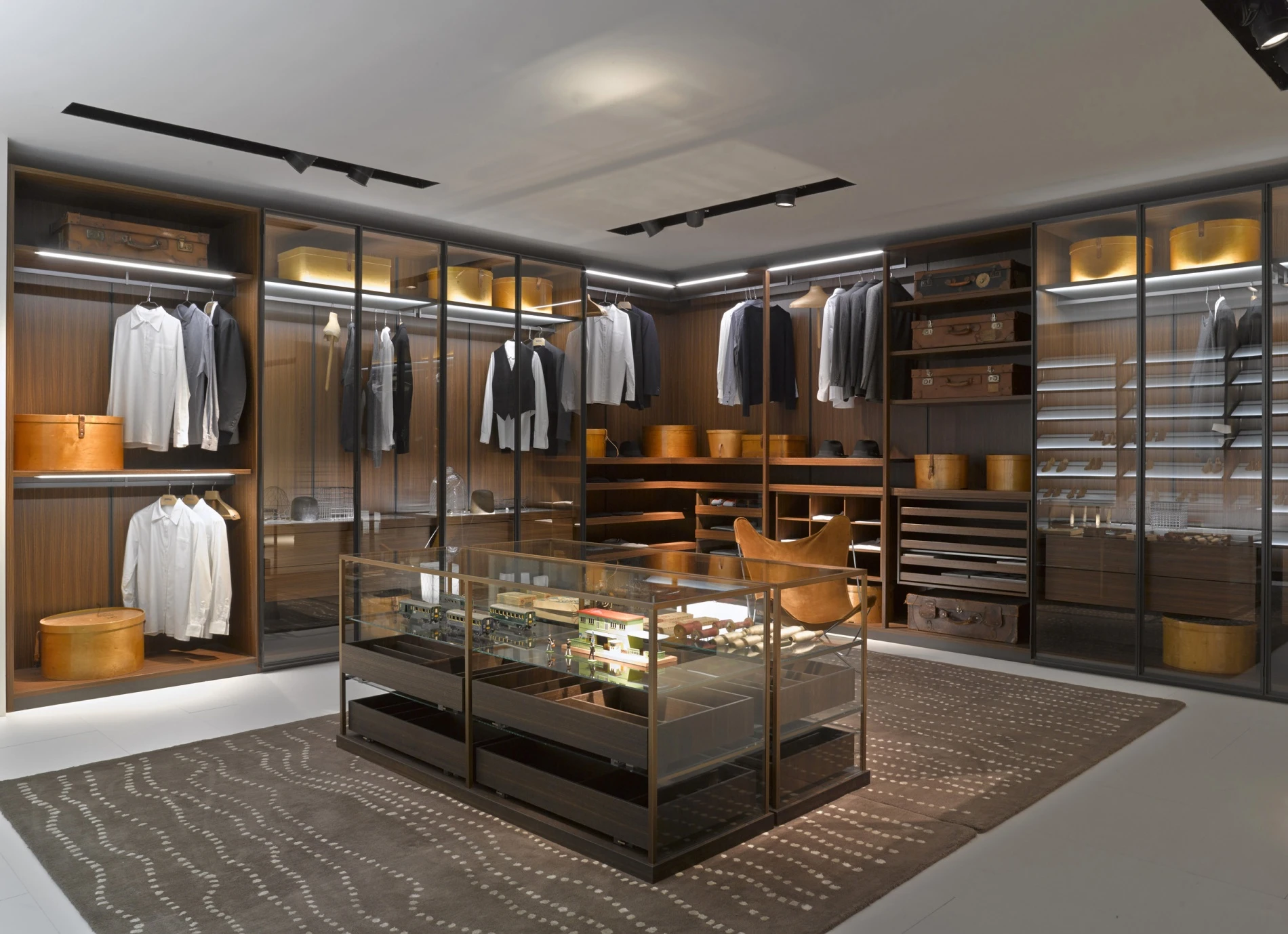 To create a secret room for your clothes, Storage walk-in closet is presented in a large angular composition in the expressive finishing of mongoi with a depth of 590 mm, that alternates on both sides open modules to modules closed by Iron doors in transparent glass with iron-look varnished metal profiles. Thanks to the new internal customisations and accessories, keeping your clothes in order has never been so easy, or fun. The shoe cabinet with inclining lighting shelves, non-inclining lighting internal shelves, glass shelves enclosed by a wooden profile so you can glimpse what's inside, the drawer with tilting removable mirror, the tie rack to hang on the panel, the removable clothes hanger hook, the bag compartment and the fabric boxes to keep inside the drawers, to keep sunglasses, necklaces, watches and belts in place: all these functional features add a warm, inviting touch to a home or elegant boutique. Among them, the new Acquario central drawer unit, perfect in the middle of a room, made in transparent glass with burnished brass profiles; divided in 3 shelves and customizable with wooden trays, in order to leave the contents visible, store them in perfect order and then extract them with ease.