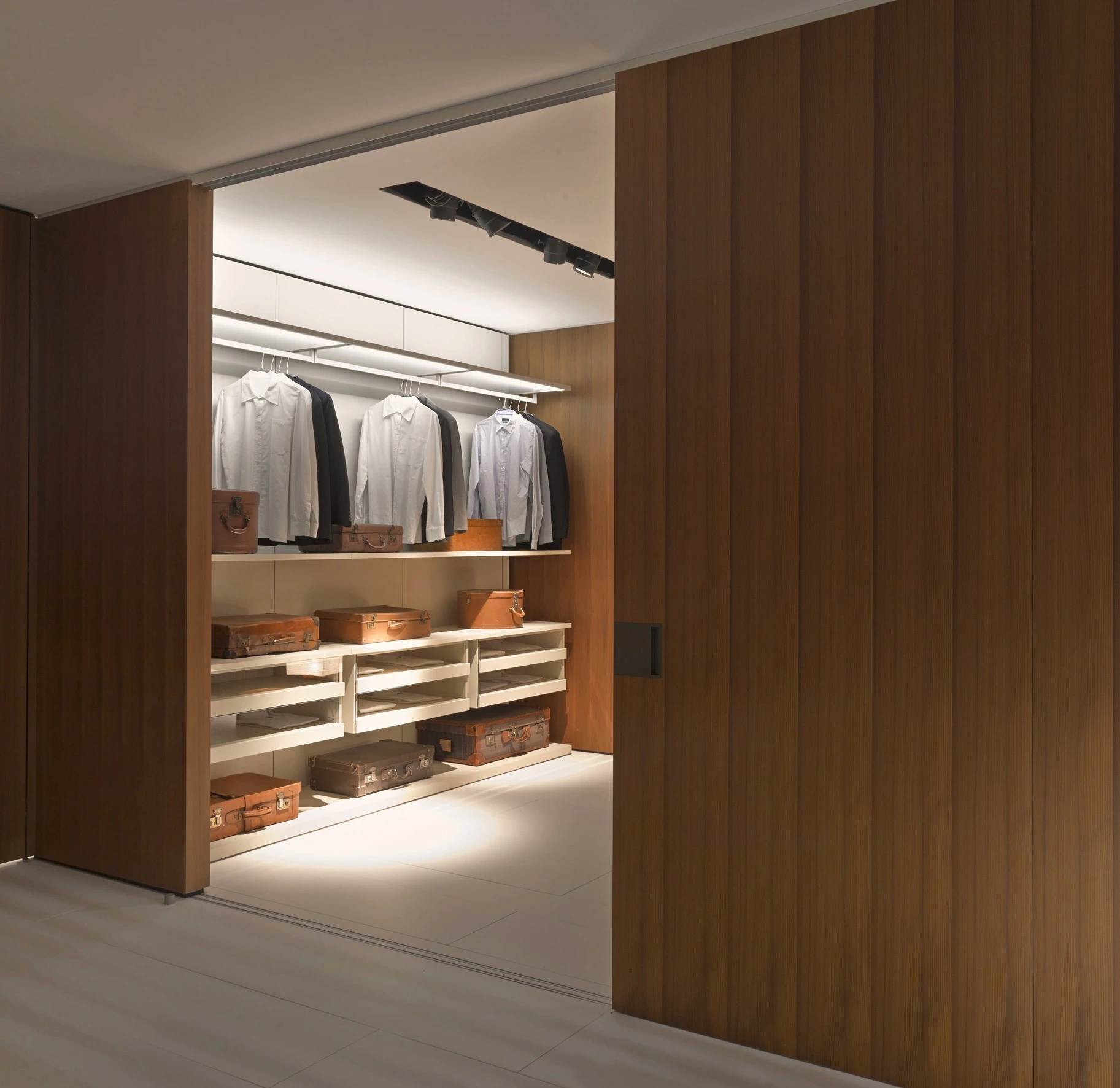 Full-length made-to-measure Shift sliding doors in heat treated tanne, architectural partitions that slide along a walkable track on the floor that does not require any structural work, enclose the Boiserie Storage presented in the new “lino” melamine finishing, a solution halfway between the walk-in closet and the open wardrobe, which extends the possibilities of this system while perfectly integrating with the other solutions. Characterized by distinctive wall panels to which the various modules can be fixed, the Boiserie is a more complete solution than the walk-in closet, but is easier on the eye than an open wardrobe, with no side panels or risers, creating a seamless surface with no frontal interruption.